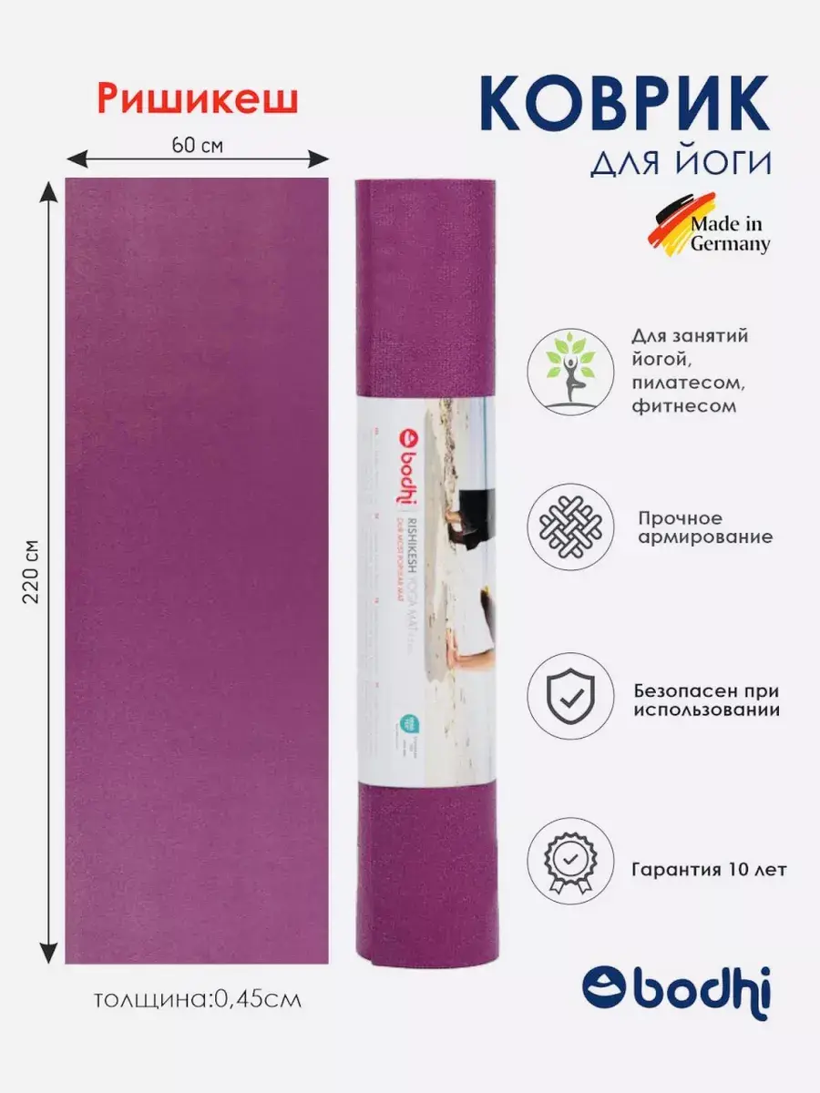 Коврик для йоги нескользящий Ришикеш Бодхи на 100% безопасный. Не содержит AZO красителей и фталатов. Сертифицирован по высшему стандарту Oeko-Tex Standard 100, класс I и OEKO-TEX детский стандарт, (номер теста 38325), что гарантирует уровень безопасности даже при контакте с кожей младенцев. Коврик произведен в Германии из ПВХ HD и отличается особой надежностью и износоустойчивостью к истиранию. Имеет гарантию производителя - 10 лет! Практика на нем позволяет как начинающим, так и опытным йогам сосредоточиться на правильном выравнивании и безопасном выполнении асан в зале и на улице. Те, кто любит заниматься спортом на природе, могут быть уверены, что трава, иголки, мелкие камни не испортят этот коврик. Рекомендации по уходу: Для очистки рекомендуется протирать влажной тканью или кратковременно ополаскивать под душем. Можно стирать в машине при температуре не выше 30°C в режиме ручной стирки без использования моющих средств. Не отжимайте и не помещайте в сушилку, так как это может повредить коврик. Для машинной стирки рекомендуется использовать стиральную машину вместимостью не менее 7 кг. Обратите внимание: Мы оцениваем его устойчивость к скольжению на 8,8 по 10 бальной шкале. Это очень высокий показатель, его не скольжение сопоставимо с ковриками из каучука с принтом. Ришикеш Бодхи это отличный вариант как индивидуального коврика для йоги так и коврика для групповых занятий.